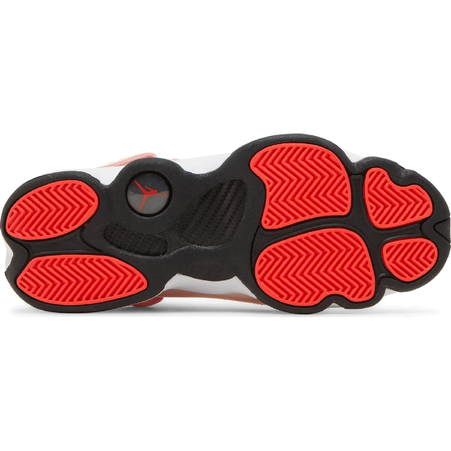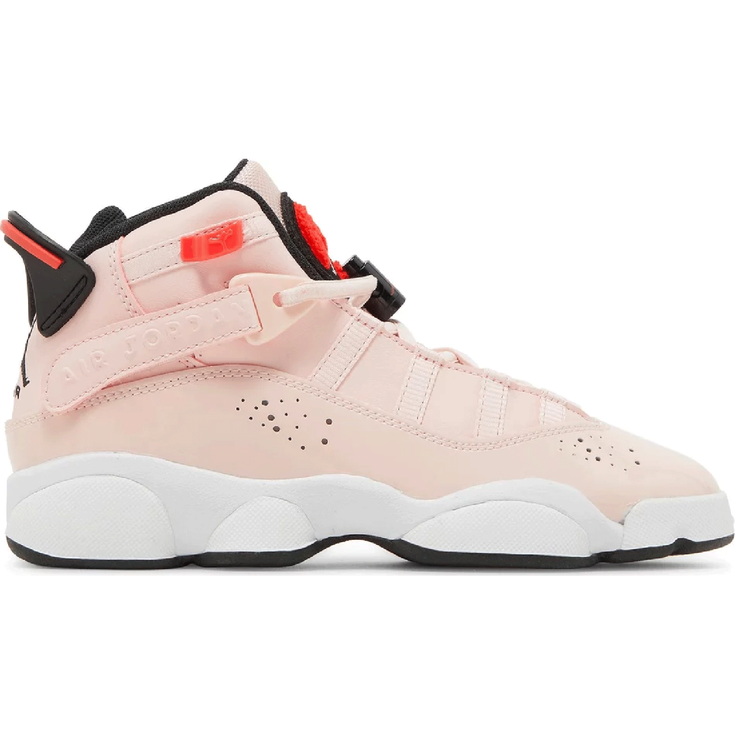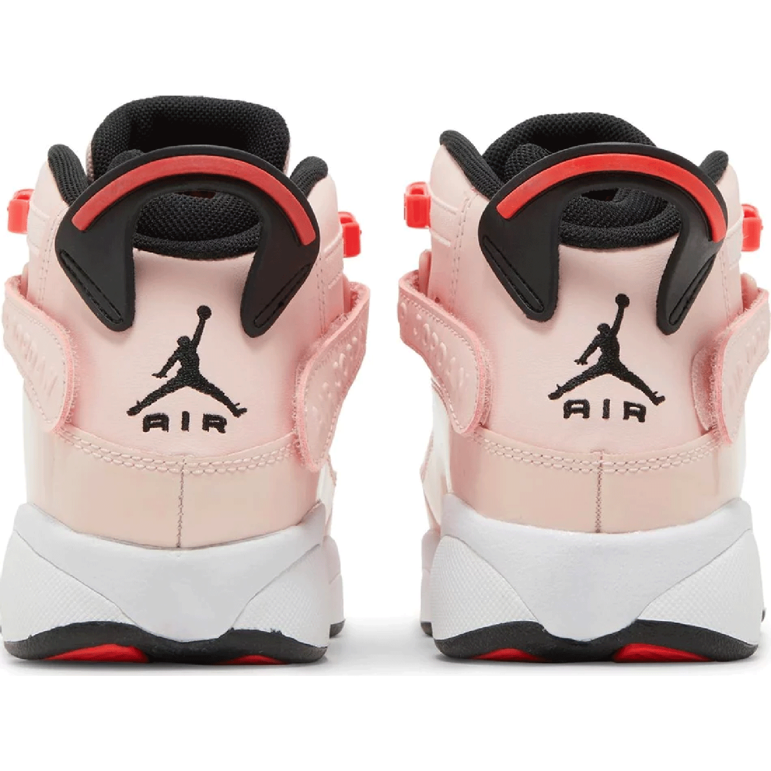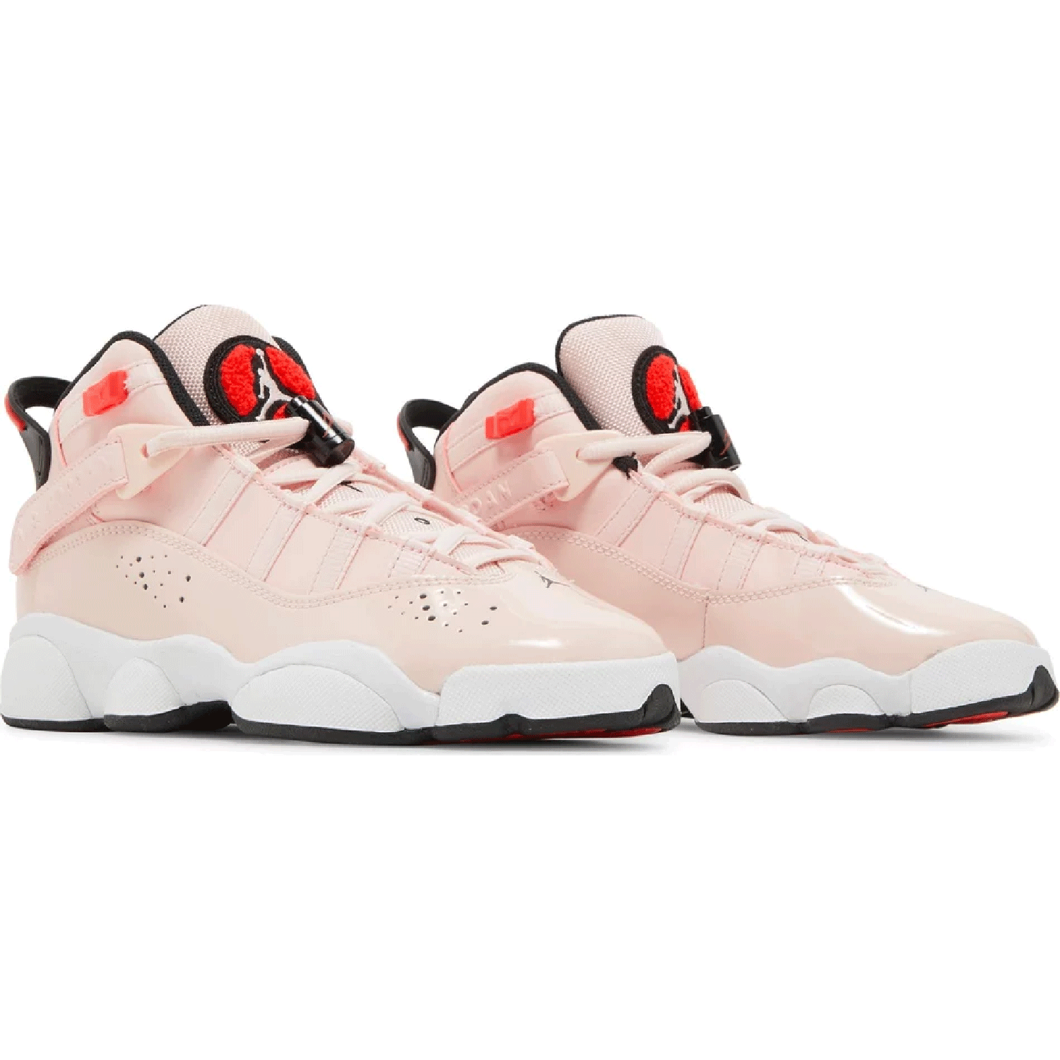 This Jordan 6 Rings gets engulfed in a soft shade of pink all throughout the upper which is constructed out of smooth and patent leather. To contrast the pink upper we see black accents throughout the branding as well as the inner liner and heel tabs along with infrared on the upper eyelets and the chenille tongue patch. White midsoles and black and infrared rubber outsoles serve as the finishing touches on this Jordan 6 Rings.